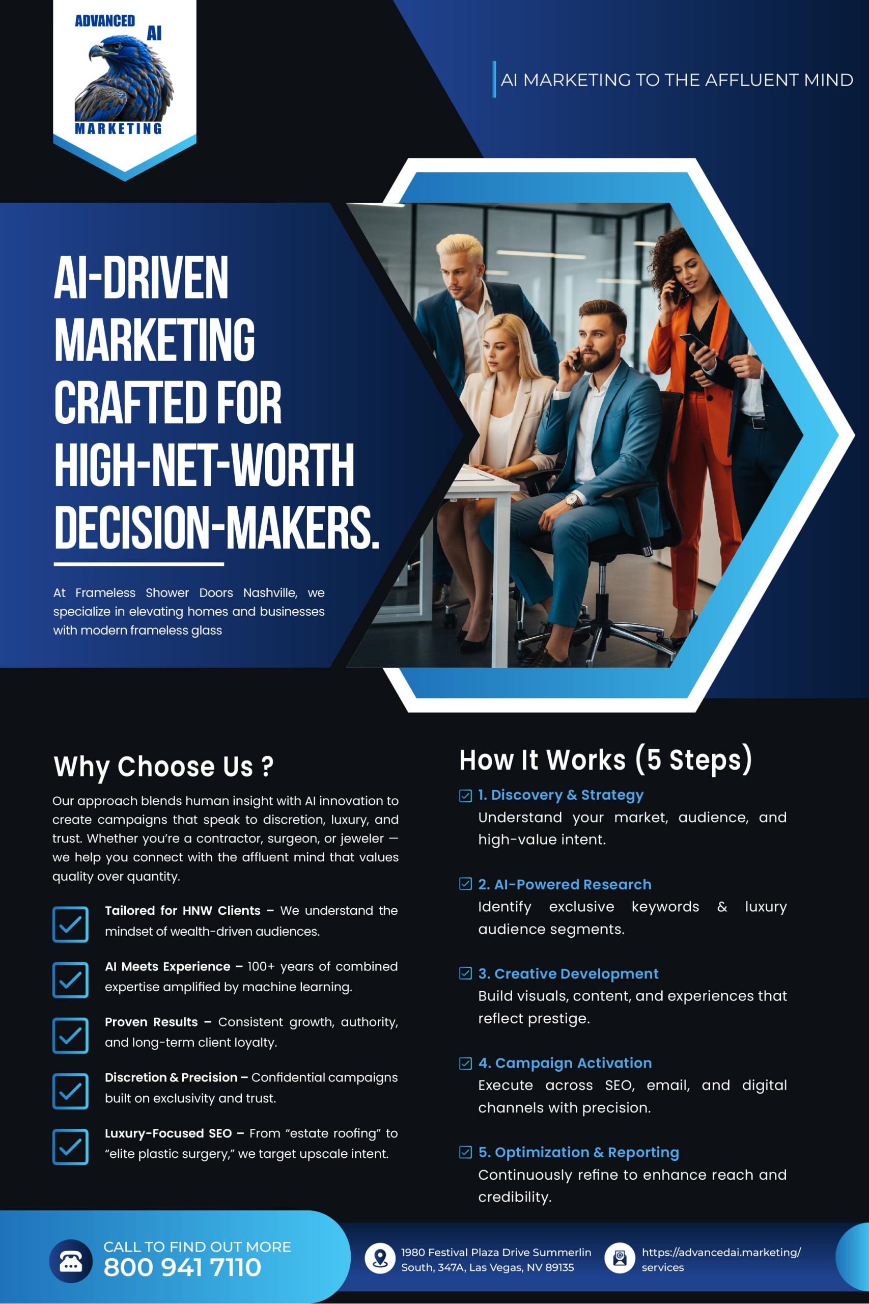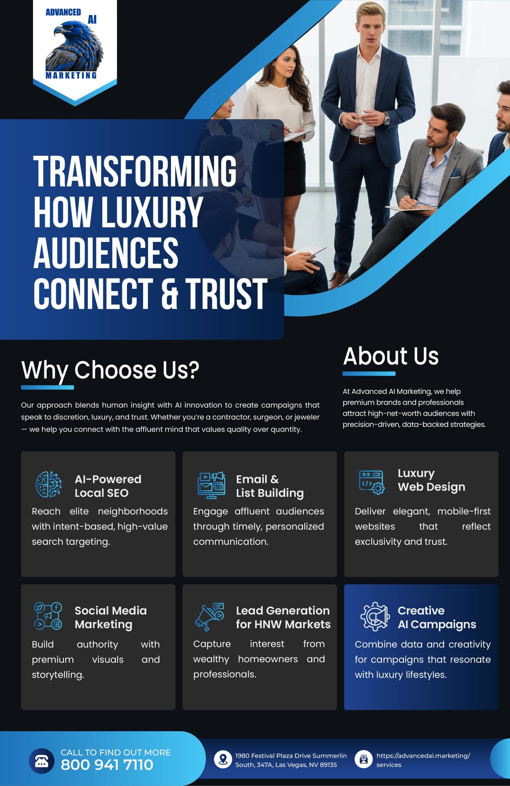 Advanced AI Marketing understands these differences. Our 12-person team has over 100 years of combined experience. By blending proven strategy with AI-powered insights, we help businesses connect with HNW audiences who value discretion and authority.
