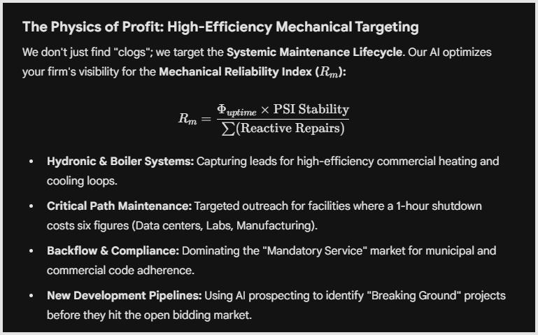 We don’t just find “clogs”; we target the Systemic Maintenance Lifecycle. Our AI optimizes your firm’s visibility for the Mechanical Reliability Index ($R_m$):