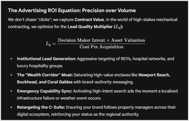 We don’t chase “clicks”; we capture Contract Value. In the world of high-stakes mechanical contracting, we optimize for the Lead Quality Multiplier ($L_q$):