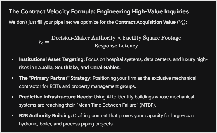 In the upper tier of the mechanical trades, a “lead” isn’t just a phone call—it’s a potential multi-year service agreement with a high-valuation asset. For commercial plumbers operating in the power centers of California, Texas, Florida, and New York, growth is a matter of Strategic Interception. You must reach facility directors and property owners at the intersection of need and capital allocation.
